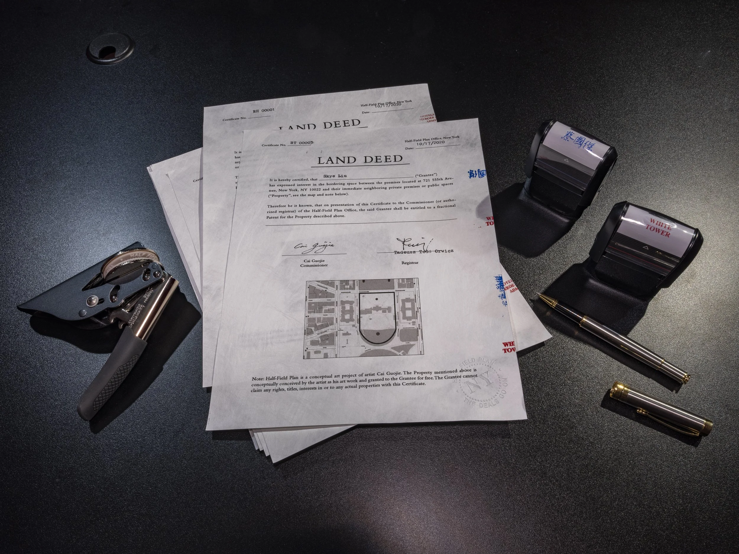 Taking this into account, artist Cai Guojie debuts his solo exhibition in NYC with his 15-year alternative real estate business named Half-Field Plan(半田計畫). It is an art project in which Cai examines cadastral maps inventively to develop conceptual land properties. Specifically, Cai identifies the liminal spaces between the boundaries of properties, marks them on the cadastral map, and grants them to the public as a form of participatory art and social commentary. Whenever a space is granted, a “land deed” is signed between the artist and the grantee. To Cai, this is a process of pursuing infinity. It provides people with the right to virtually own any piece of land in the world.